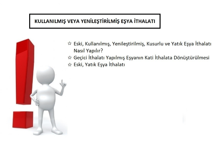 Ancak eşyanın geçici ithalatı esnasında kullanılmış ve yenileştirilmiş olması durumunda yukarıdaki esaslar doğrultusunda gerekli izinlerin alınması gerekmektedir.