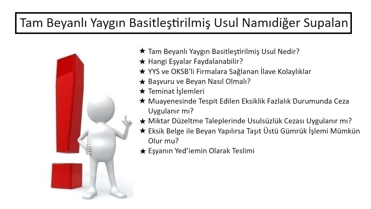 Gümrük işlemlerinin mümkün olduğunca basitleştirilmesi ve hızlandırılması amacıyla Gümrük Kanunu’nun 71. Maddesi uyarınca birtakım basitleştirmeler uygulanmaktadır. Geçtiğimiz aylarda bu madde kapsamda uygulanan eksik belgeyle beyan konusunu kaleme almıştık. Bu makalemizde ise aynı uygulama tebliğinde bulunan “tam beyanlı yaygın basitleştirilmiş usul” eski adıyla supalan (taşıt üstü gümrük işlemleri) kaleme alınmıştır. Tam Beyanlı Yaygın Basitleştirilmiş Usul Nedir? Normal şartlarda ithal edilecek