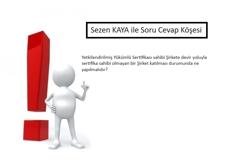 Soru-1 Yetkilendirilmiş Yükümlü Sertifikası sahibi Şirkete devir yoluyla sertifika sahibi olmayan bir Şirket katılması durumunda ne yapılmalıdır⁉️ Gümrük İşlemlerinin Kolaylaştırılması Yönetmeliğinin 4/4 maddesine göre; Sertifika sahibi şirkete, devir suretiyle sertifika sahibi olmayan bir başka şirketin katılması durumunda; 👉Devir alma işlemin tescil edildiği tarihi izleyen 5 iş günü içerisinde gümrük idaresine bildirilir. 👉Bu tarihi izleyen 60 iş günü içerisinde 10’uncu maddede