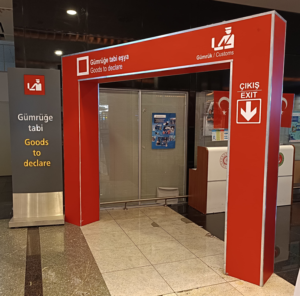 Elektronik ortamda beyanın yapılması ve uçaktan indikten sonra aşağıda fotoğrafı bulunan kırmızı kapıdan devam edilmesi gerekir. Kırmızı kapı yolcu yanındaki eşyanın “beyana tabi olduğunu” ifade etmektedir. Yeşil kapıdan ilerlenmesi durumunda beyana tabi eşyanın bulunmadığı anlamı çıkmaktadır.